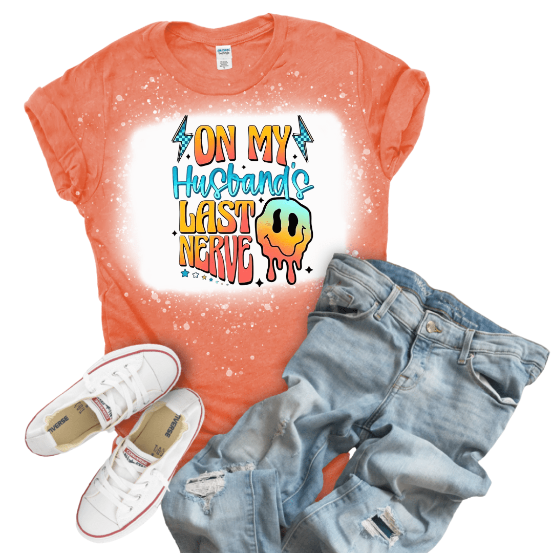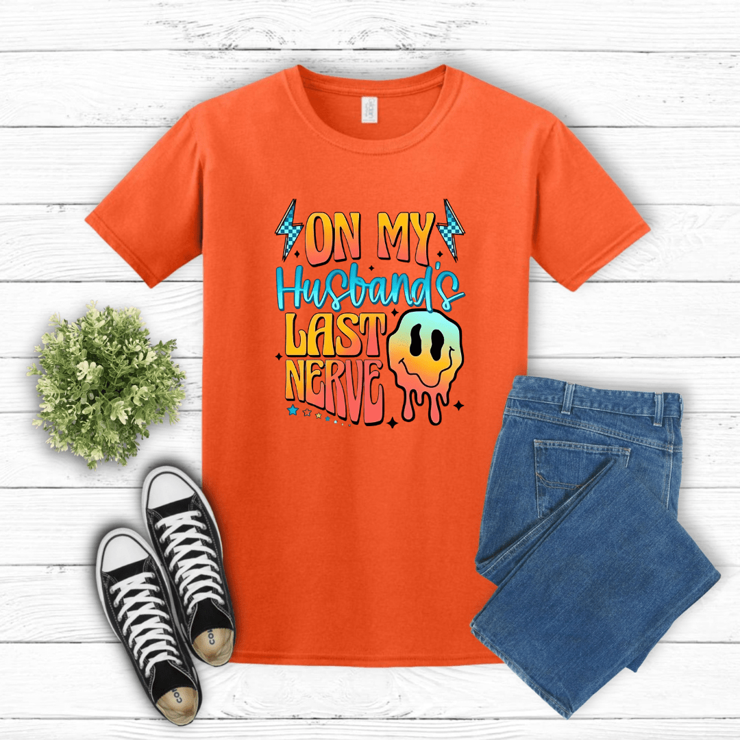 Proudly announce your special talent with our "On My Husband's Last Nerve" sublimation t-shirt. This conversation-starting design perfectly captures that unique relationship dynamic where pushing buttons is your superpower. The vibrant, fade-resistant print ensures your message remains crystal clear, just like your intentions. This hot new addition to our collection is available for a limited time only – secure yours now and wear your relationship status with a knowing smile!
