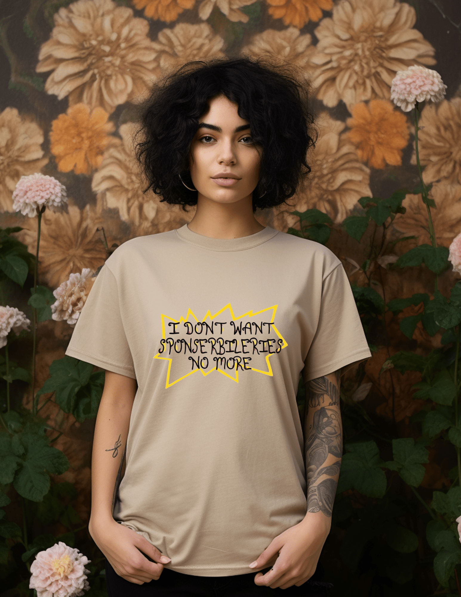 Inject some humor and attitude into your wardrobe with the I Don’t Want Sponserbileries No More T‑Shirt. This beige graphic tee combines vintage vibes with internet humor, featuring a playful hand‑lettered quote inside a bold yellow comic‑style starburst.