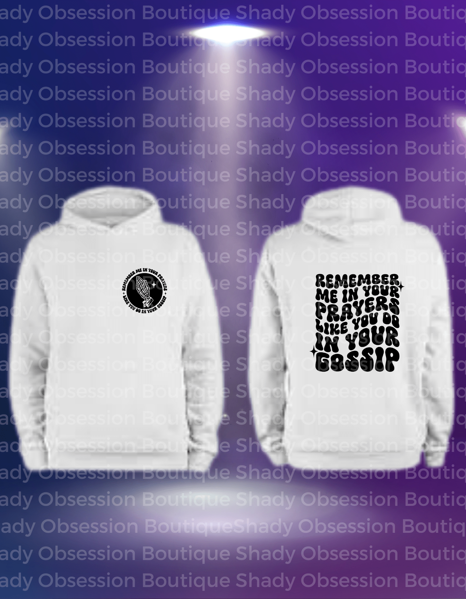 Keep warm and show your sass with this hot new hoodie! The "Remember Me In Your Prayers" Hoodie is the perfect way to cover up with a cheeky wink - just don't forget to tag us in that killer selfie! (After all, there's no point in looking this good if no one will see it, right?)